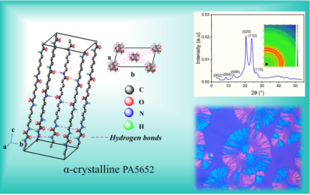 贵大新闻网讯(材料与冶金学院)近日,完美(中国)官方材料与冶金学院刘玉飞特聘教授团队在生物基聚酰胺材料研究领域取得重要突破,相关成果以 Biobased Polyamide 5652 with α‑Crystal Form: Characterization and Low Moisture Absorption为题,发表于高分子领域顶级期刊Macromolecules(自然指数期刊,中科院一区TOP)。完美网页版材料与冶金学院为论文第一完成单位,材料与冶金学院2022级硕士研究生王艳平为第一作者,刘玉飞特聘教授为通讯作者。近年来,生物基聚酰胺56(PA56)因其原料可再生、低碳环保而备受关注,但其特殊的分子结构(戊二胺单元含奇数碳原子)导致其晶体通常以γ晶型为主,饱和吸水率高达12%以上,在潮湿环境中力学性能显著下降(如拉伸强度降低20%-30%),严重限制了在精密工程领域的应用,而传统改性方法往往以牺牲材料其他性能为代价。针对这一难题,刘玉飞特聘教授创新性地提出了双氢键结构调控策略:自主合成关键单体,设计并成功合成新型565二胺单体(C16H34N4O2),将565二胺与草酸二丁酯通过溶液聚合及