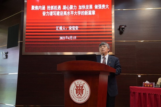 Song Bao’an, academician of the Chinese Academy of Engineering and President of Guizhou University, presented a report based on a review of the 13th Five-Year Plan, the general guidelines of the 14th Five-Year Plan, as well as the blueprint for the next phase of work. His speech centered on several objectives which emphasized remaining committed to fundamental guidelines, utilizing every presented opportunity, staying firmly united, increasing the speed of development, continuing to further empower the university, and building a world-class higher-education institution.