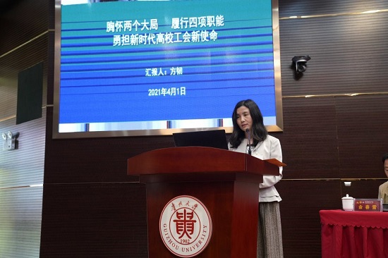 Ran Guanggui, director of the Development Planning Department, briefs attendees on the career development targets for Guizhou University’s 14th Five-Year Plan period (2021-2025) as well as the university’s implementation strategies for educational assessment reform that is appropriately tailored for the new era.