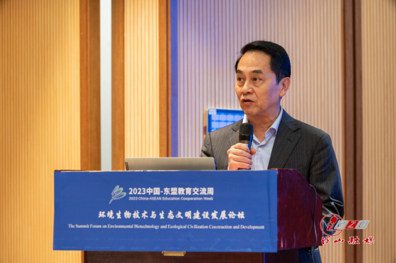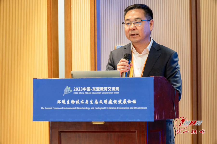 On September 1, the first Summit Forum on Environmental Biotechnology and Ecological Civilization Construction took place at the permanent site of the China-ASEAN Education Cooperation Week (CAECW). The forum was organized by GZU in collaboration with institutions including the Field Science Observation and Research Station of the Ministry of Education for Guizhou Karst Environmental Ecosystem. Themed “Low-Carbon Green, Innovative Development”, this event aimed to align with new circumstances, seize emerging opportunities, and actively explore the harmonious coexistence prospects of humans and nature in the context of carbon peaking and carbon neutrality goals. The forum was conducted through a combination of both online and offline methods.